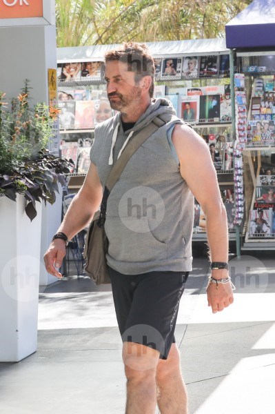 West Hollywood, CA - Gerard Butler is seen arriving at Soul Cycle. The actor gears up to sweat it out. Gerard is wearing athletic shorts and a sleeveless hoodie paired with sneakers.