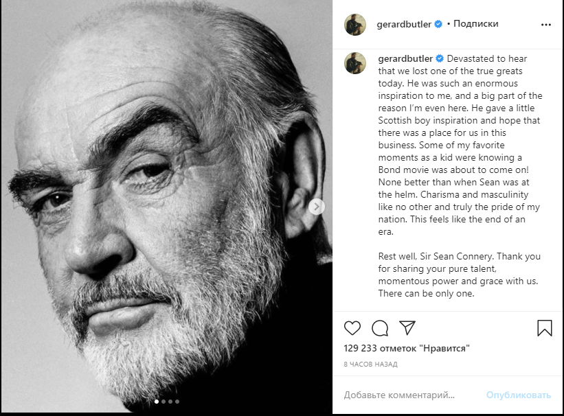 Опустошен, узнав, что сегодня мы потеряли одного из истинно великих людей. Он был таким огромным вдохновением для меня, и большая часть причины, по которой я даже здесь. Он дал маленькому шотландскому мальчику вдохновение и надежду, что для нас найдется место в этом бизнесе. Некоторые из моих любимых моментов в детстве были связаны с тем, что я знал, что скоро выйдет фильм о Бонде! Нет лучше, чем когда Шон был у руля. Харизма и мужественность, как ни кого другого, и поистине гордость моей нации. Это похоже на конец эпохи.