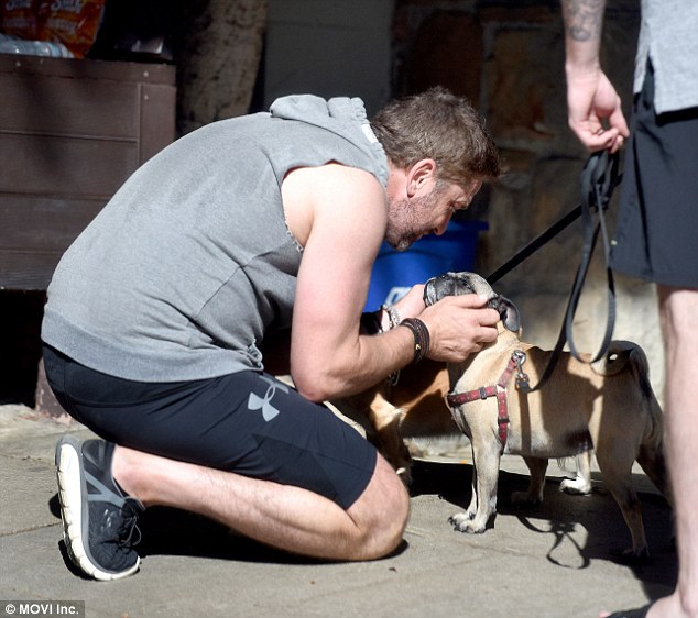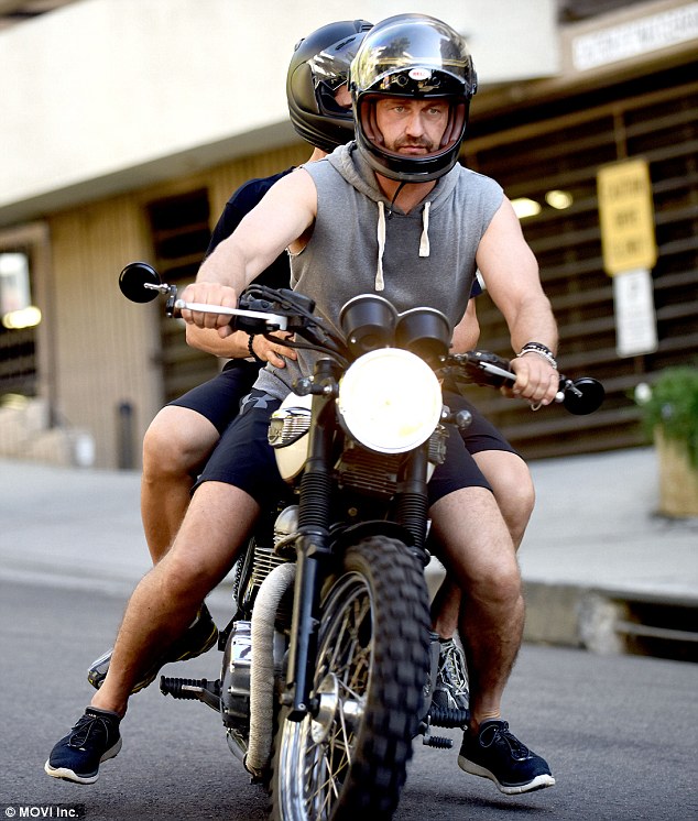 What a man! Gerard Butler looks the tough guy driving off on motorbike after workout... but not before kissing a puppy