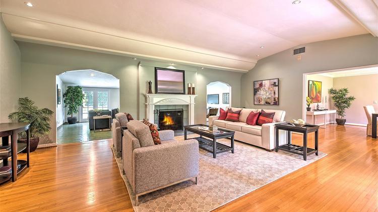 Ряды французских дверей расширяют жизненное пространство за пределы, ведут к внутреннему дворику и бассейну. Газоны, деревья и отдельно стоящий гараж на две машины заполняют пространство более чем на треть акра.