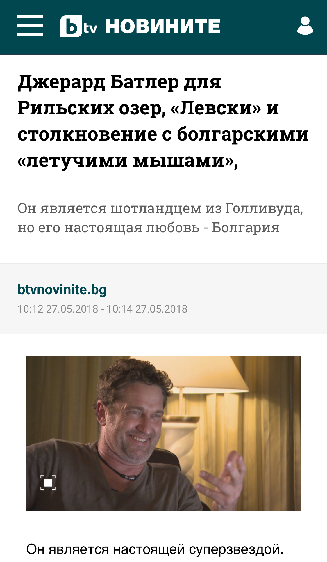 Он настоящая суперзвезда. Мало кто из нынешних актеров, которые могут сравниться с несколькими поклонниками. Он шотландский актер из Голливуда, но его настоящая любовь - Болгария. Вы должны убедиться, что он знает о нашей истории, Риле, озерах, Левски, собаках и ... «ублюдках» больше, чем любой другой актер, который вступил в нашу страну. Джерард Батлер в эксклюзивном интервью.
