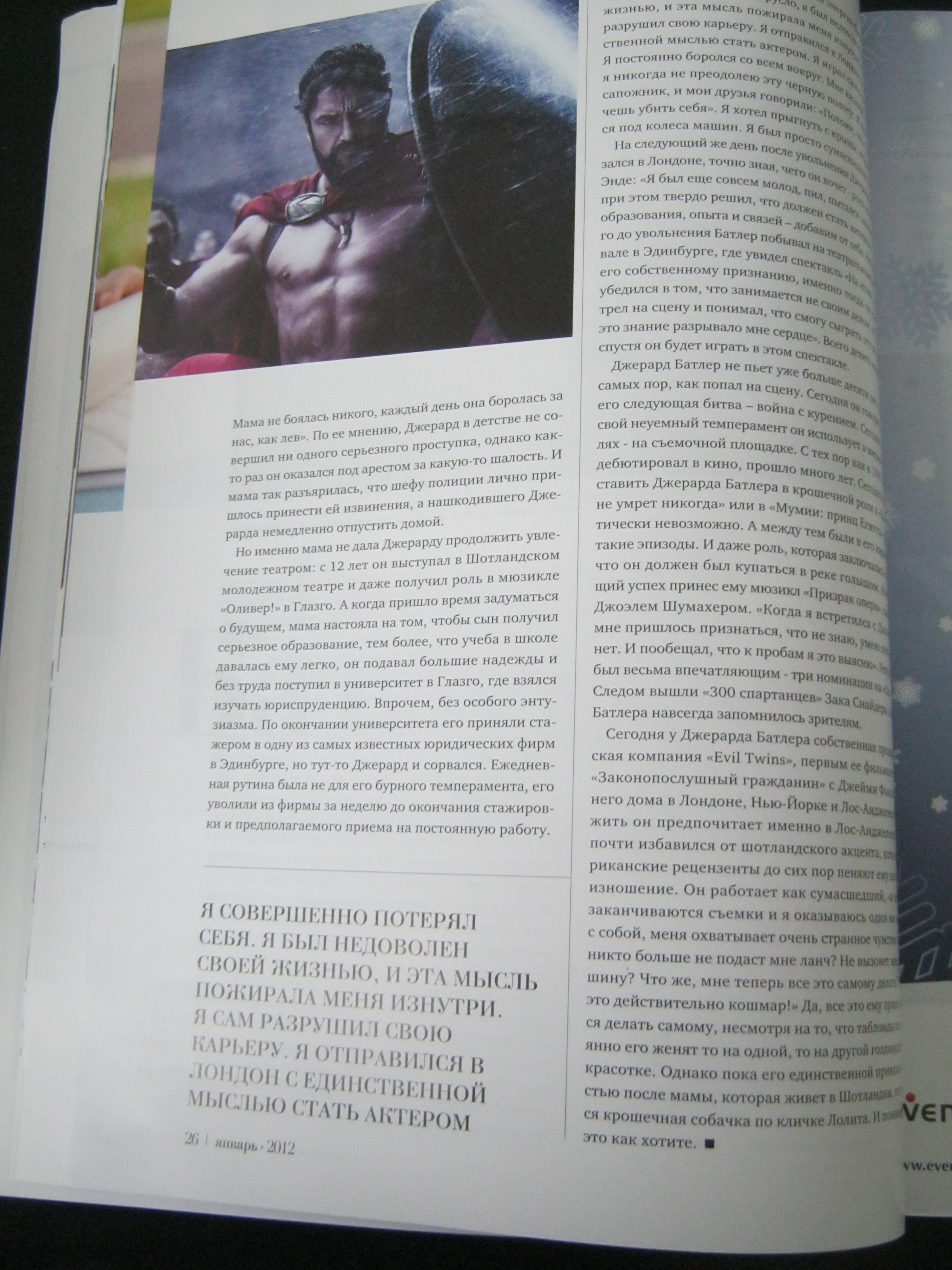 Я честно не собираюсь беспокоиться, что он или кто он такое, в то время как он наслаждается текущим карнавалом своей жизни. Да будь у него три жены и двенадцать детей, он всё равно был бы самой горячей штучкой на планете. (И я думаю, что и до знаменитой шалавы он знал, кто он такой. Эта слава — палка о двух концах. Я думаю, что повестка дня «кто есть Джерард Батлер?» осталась в прошлом). Я надеюсь, она наслаждается своими пятнадцатью минутами славы с оттенком аморальности. У Джерри полно друзей в высших эшелонах власти.