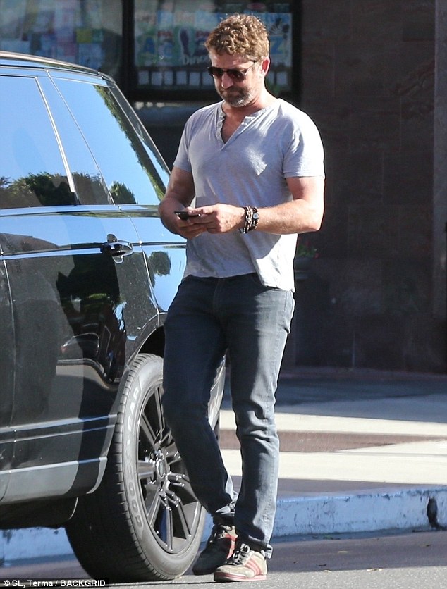 Gerard Butler cuts a rugged figure in t-shirt and blue jeans a store in Beverly Hills