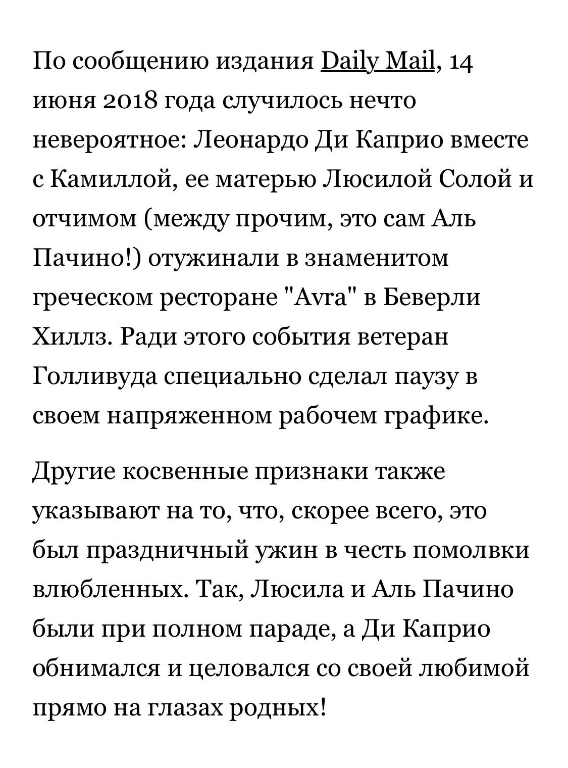 Я была на вечеринке подруги моей двоюродной сестры (Леонардо - крестный ее ребенка), какая-то леди перепутaла там меня со своей дочкой и швырнула в бассейн (я тогда еще не умела плавать), я начала тонуть, моя двoюродная сестра заметила это и позвала на помощь, и О БОЖЕ, человеком, который прыгнул в бассейн и вытащил меня был Леонардо ДиКаприо.