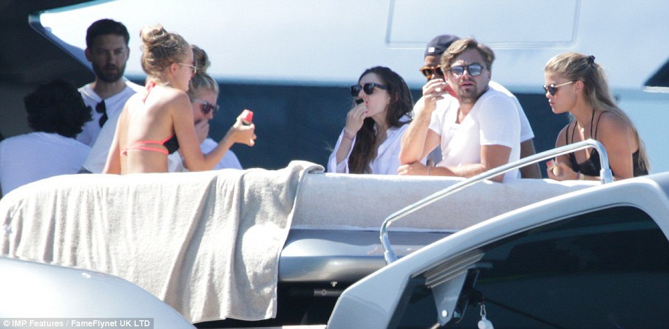Лео на отдыхе с друзьями (Тоби Магуайером и др.) и своей девушкой Ниной Агдал (24 июля, Ибица)