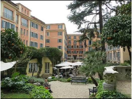 Hotel de Russie (Le Jardin de Russie). Там обширная территория, поднимающаяся на холм к вилле Боргезе.