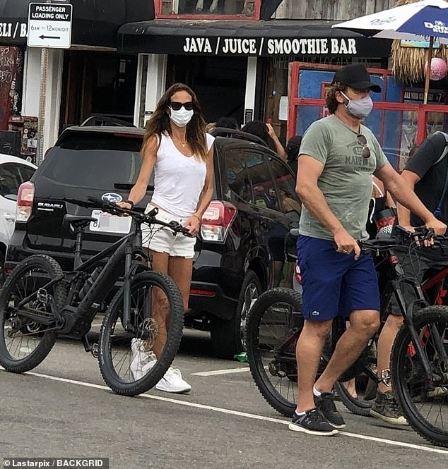 Джерард Батлер получает поцелуй от подруги Морган Браун (но держит маску на лице), когда они наслаждаются велосипедной прогулкой по Венис-Бич