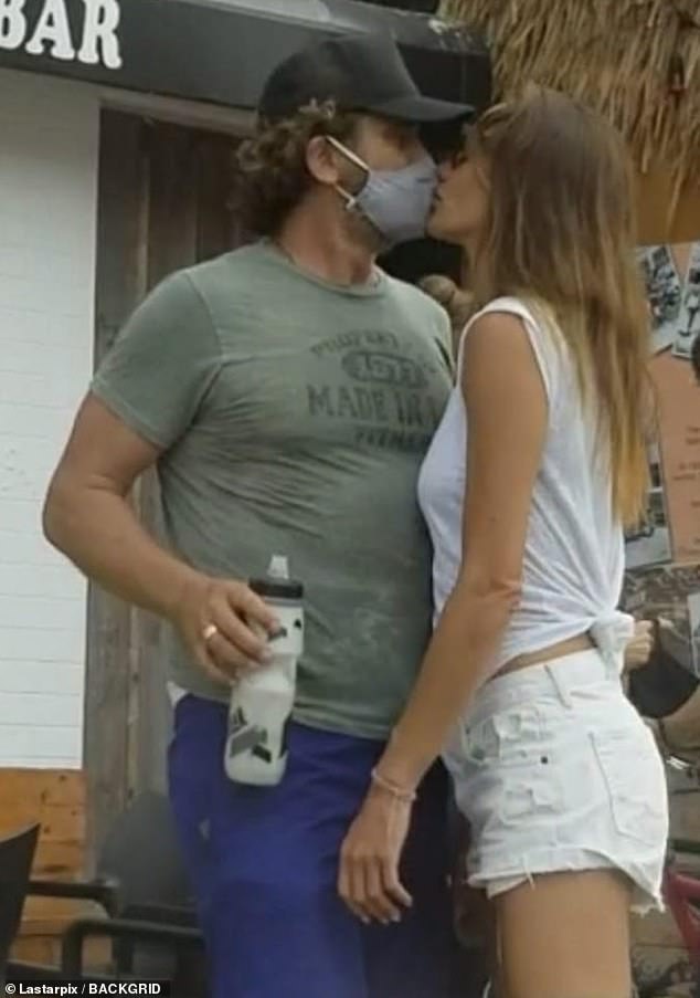 Джерард Батлер получает поцелуй от подруги Морган Браун (но держит маску на лице), когда они наслаждаются велосипедной прогулкой по Венис-Бич