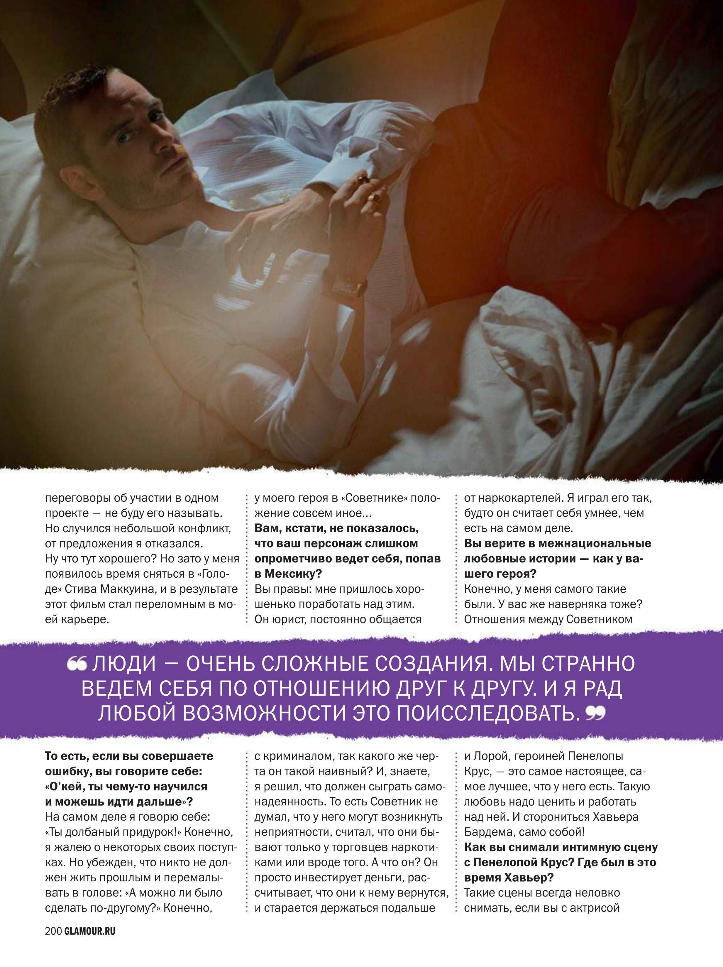 MF: Все что вы можете сделать, это абстрагироваться от всего. Это немного разочаровывает, потому что я хотел, чтобы люди смотрели фильм ради его смысла, а не ради этого предмета всеобщего обсуждения. Но что ты им можешь сказать:"Это не очень красиво! Прекратите обсуждать мой пенис!" Порой необходимо не обращать внимание на чужие мнения. Я смотрел интервью с Эриком Катона, и они обсуждали его трофеи и награды. И он признался"В моём доме я ничего из этого не держу. Они нагоняют на меня депрессию. Это заставляет зацикливаться на прошлом. Я думаю о том, что я собираюсь сделать завтра." Я думаю, это правильная установка. "12 лет рабства" и "Советник" закончены. Теперь я думаю о том, что я должен делать дальше. Мне следует к этому подготовиться.