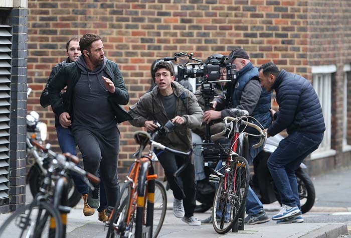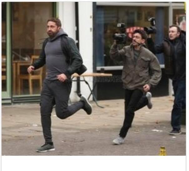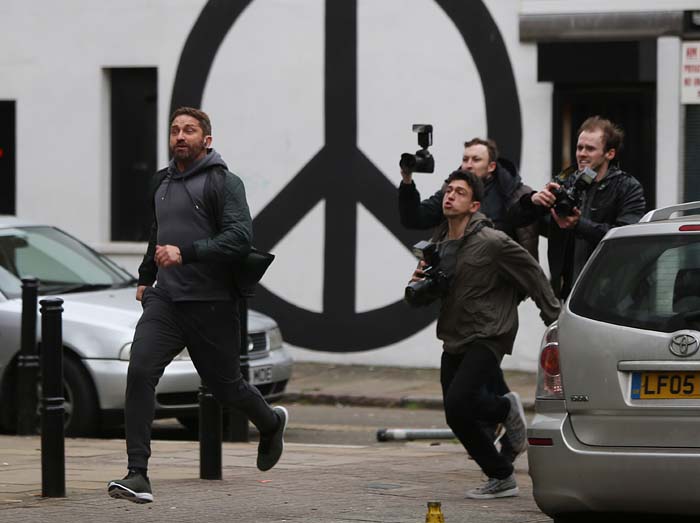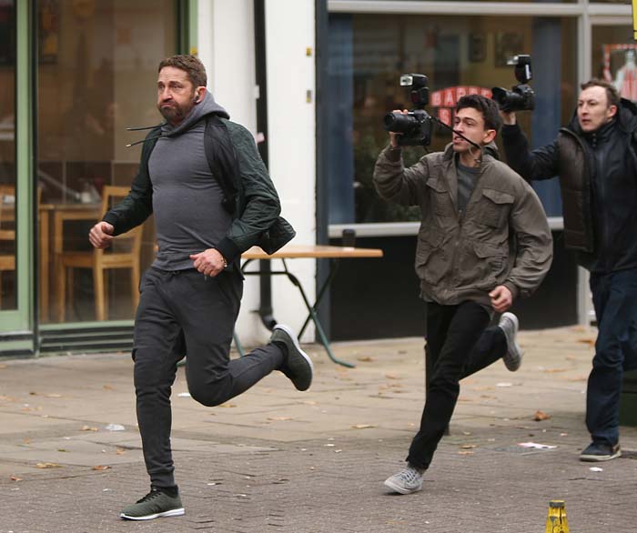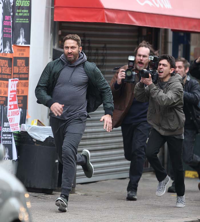 Реальная жизнь ... или жизнь катушки (ролика)? Джерард Батлер бежит из папарацци во время съемок рекламного ролика в четверг в Лондоне