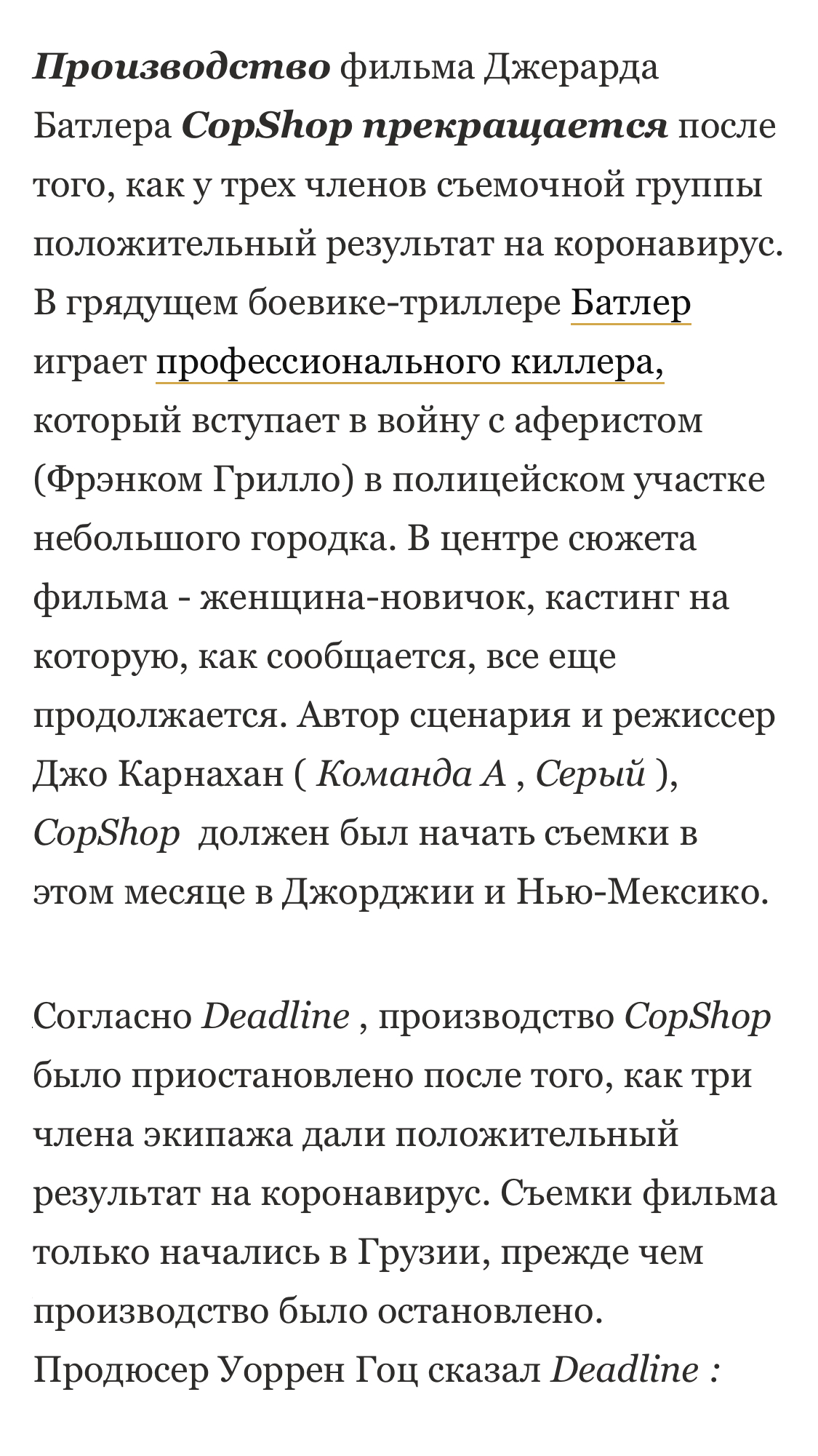 https://deadline.com/2020/10/alexis-lou ... 234591824/ Фильм Джо Карнахана "Копшоп", только что возобновил производство в Джорджии после временной остановки из-за того, что три члена съемочной группы дали положительный результат на COVID-19.