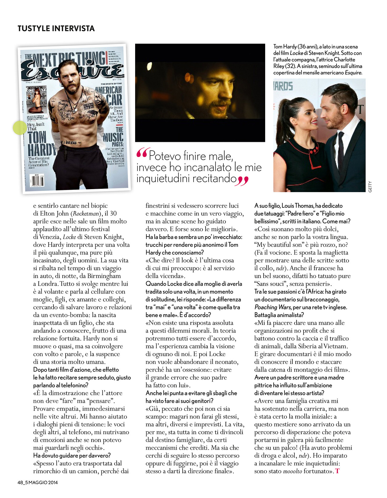 В итальянском журнале Tu Style (май 2014) вышло интервью с Томом, в котором я не вычитала ничего нового. Всё об одном и том же: про татуировки, про Лока, про его борьбу против браконьерства.