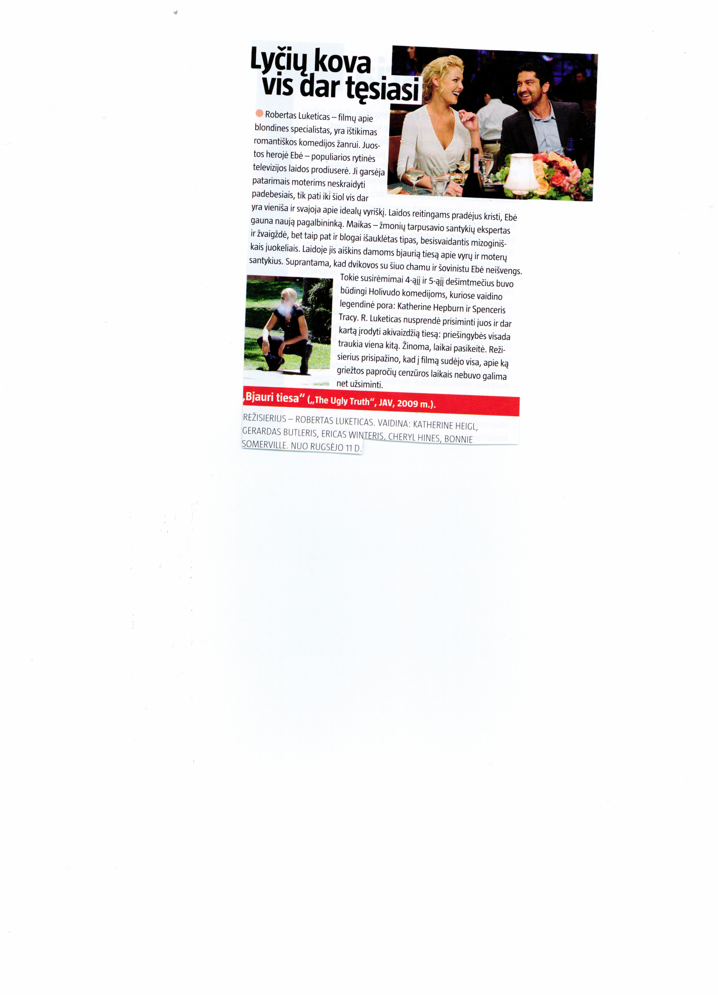 Альтернативу кошмарных приключений предложит женская романтическая комедия „Голая правда“ (The Ugly Truth): про любовь, свидания, провокации чувств, разбитые сердца и поиски этого единственного принца, когда он незамечаемый крутиться здесь-же. Такие стильные, красивые, сладкие, весёлые, легко предполагаемые и необязывающие фильмы в Литве очень любят, так как на „Сексе в большом городе“ воспитанные зрители свободное время с удовольствием проводят в кинотеатрах когда не надо думать и окончание бывает ясным через первых пять минут. Никаких тайн и сюрпризов, а только ещё одно по алфавиту жанра клонированное романтическое зрелище про всегда трудные отношения мужчин и женщин. Их смотреть не скучно, но в памяти на долже не задерживаются. На крючок комедий попавшая Kатрин Хеигл (Katherine Heigl) старается не повторяться как в „27 свадьбах“, но тримя женщинами написан плыткий сценарий не даёт показаться прекрасной актрисе.