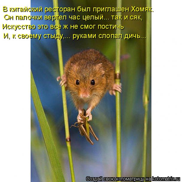 :lol: :good: до чего ж они потешные. Правда, у нас был один из хомяков ну такой злобный. он не давал менять ему подстилку в клетке и нападал кусался и, даже издавал такие звуки, похожие на лай, т.е. он нас облаивал... :lol: Мы вынуждены были опускать в клетку молочный пакет и, загнав его туда, вытаскивали. Он там пережидал чистку клетки. А когда его выпускали обратно, он вылетал как бешеный, начинал метаться, прыгать, беситься, визжать. Все грыз чистое и разбрасывал и, только тогда успокаивался, когда превращал клетку в подобие помойки и всю чистоту уничтожал напрочь. Тогда он довольный зарывался во весь этот нагрызенный мусор и засыпал. Видимо это был какой то особенный вид хомяков, Хомяк-помоишник, а мы то и не разглядели в нем этот эксклюзив.... :crazy: :evil: