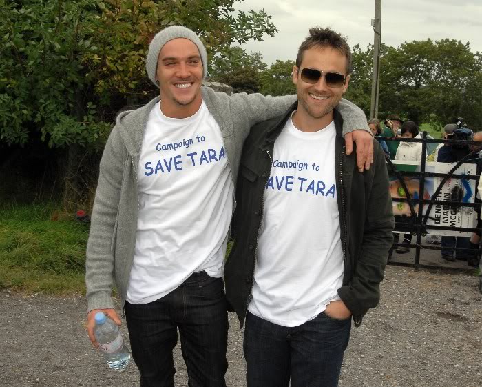 Ирландцы по происхождению, актеры Стюарт Таунсенд и Джонатан Риз-Майерс на днях участвовали в акции протеста по спасению исторического холма Тары Суть проблемы: через Тару ирландские власти решили проложить гоночную трассу М3. Общественность взбунтовалась не на шутку: помимо всех известных исторических ценностей Тары, совсем недавно рядом с холмом было обнаружено древнее церемониальное строение 80 м в диаметре, являющееся частью археологического комплекса Тары, где короновалось 142 ирландских короля и собирались все друиды, воины и просто жители Зеленого Острова. Люди организовали сбор подписей против строительства, куда голоса принимались со всего мира. И вот в минувшее воскресенье тысяча демонстрантов во главе со Стюартом и Джонатаном собрались на холме, вооруженные арфами, мегафонами и праведным гневом. Одновременно с ними акции протеста прошли в Чикаго, Лос-Анжелесе и Нью-Йорке.