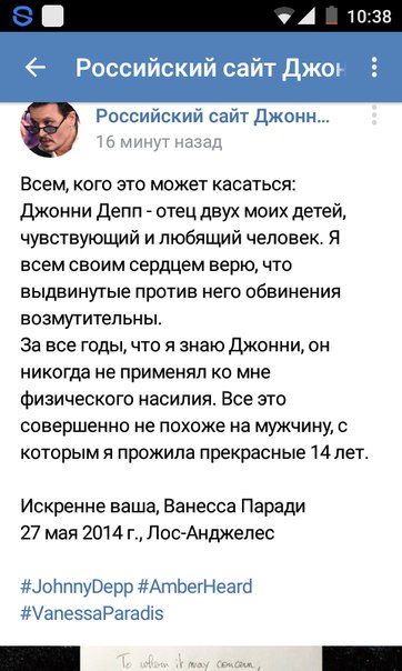 Я не люблю Деппа ни в каком качестве, но я на его стороне. Мне всегда казалось, что Херд нагловатая и продуманная девица, не верю я в избиения. Если бы он был алкоголиком и избивал женщин - за 14 лет с Паради он бы точно сорвался. А Ванесса очень самодостаточная женщина, она бы не стала терпеть такое обращение.