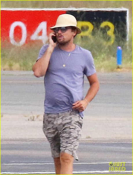 Леонардо перед отлётом из Сен-Тропе (22 июля). Компанию актеру составляют друзья Тоби Магуайр и Винсент Лареска, телохранитель Реза и крестник Милан.