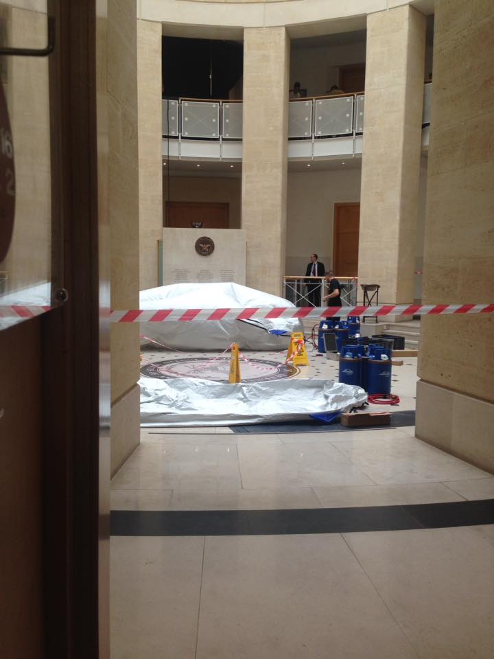 Нереальная неделя на работе. Наше здание используется в качестве двойника для Пентагона в фильме Гэри Олдман и Common (и якобы Джерарда Батлера, но не было никаких его появлений) были съемки сцены буквально через 30 секунд от моего стола. Вот делают фото Common между дублями. Хотел хлопнуть его и говорить хип-хоп с ним, но было по-видимому, отставание от графика, и они закончили снимать в 3:30 #common #thebitchinyoo #hunterkiller