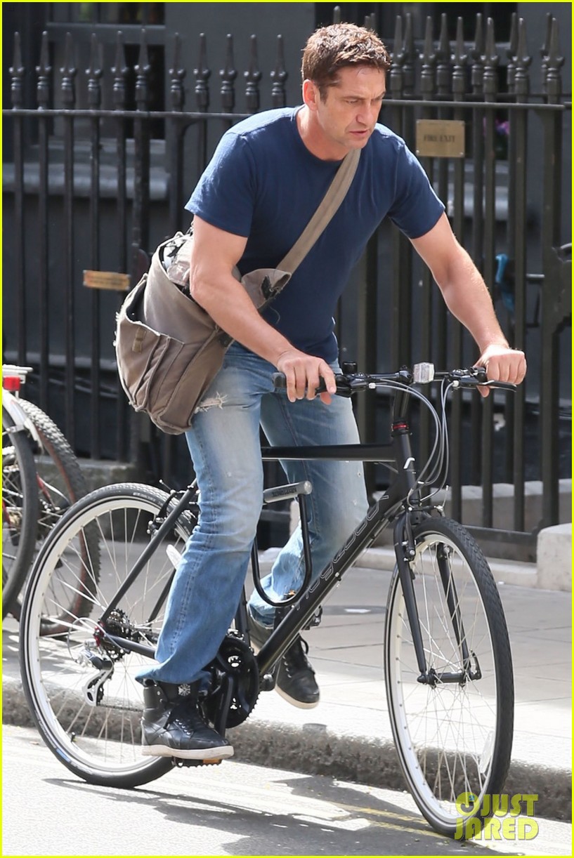 11.August.2016 - London - UK **EXCLUSIVE ALL ROUND PICTURES** 'London has Fallen' star Gerard Butler looks to have found another way to travel around the capital as the Scottish actor took to the streets of London on his bike.