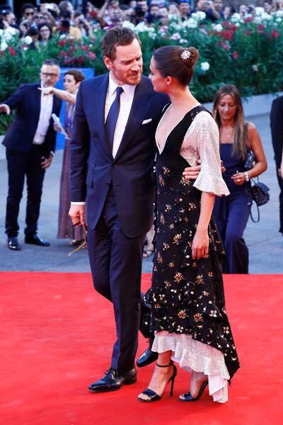 Michael Fassbender and Alicia Vikander getting out of their press conference during the Venice Film