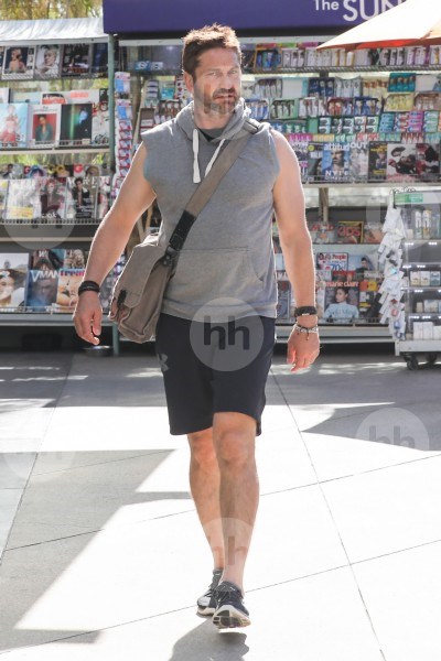 West Hollywood, CA - Gerard Butler is seen arriving at Soul Cycle. The actor gears up to sweat it out. Gerard is wearing athletic shorts and a sleeveless hoodie paired with sneakers.