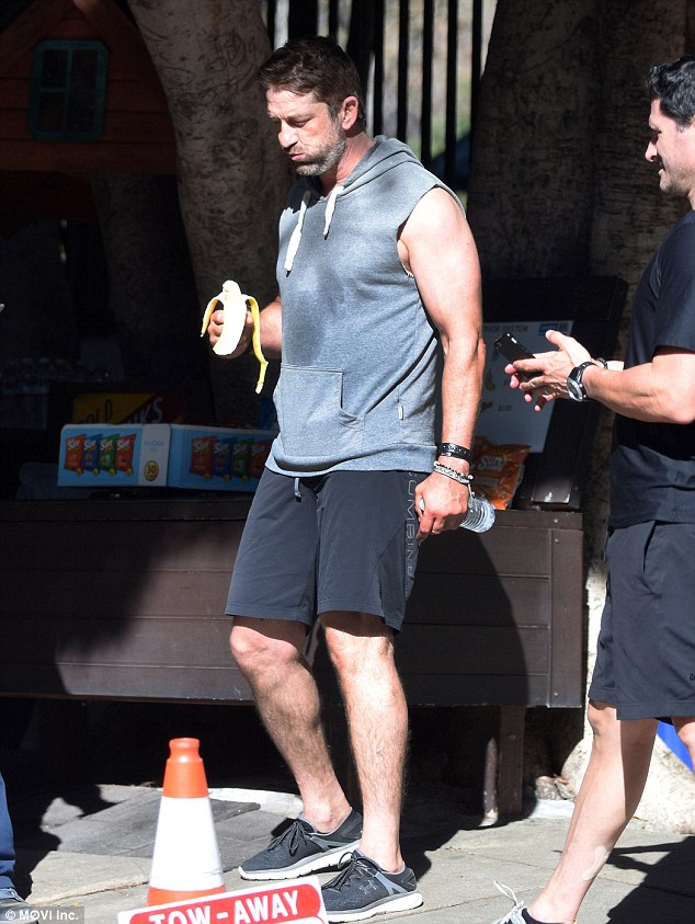 What a man! Gerard Butler looks the tough guy driving off on motorbike after workout... but not before kissing a puppy
