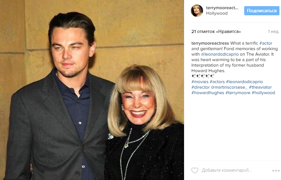 Неделю назад американская актриса Терри Мур, опубликовала совместную с Леонардо фотографию (с премьеры фильма "Авиатор" (2004) ) и пост в своем Инстаграме https://www.instagram.com/terrymooreactress/