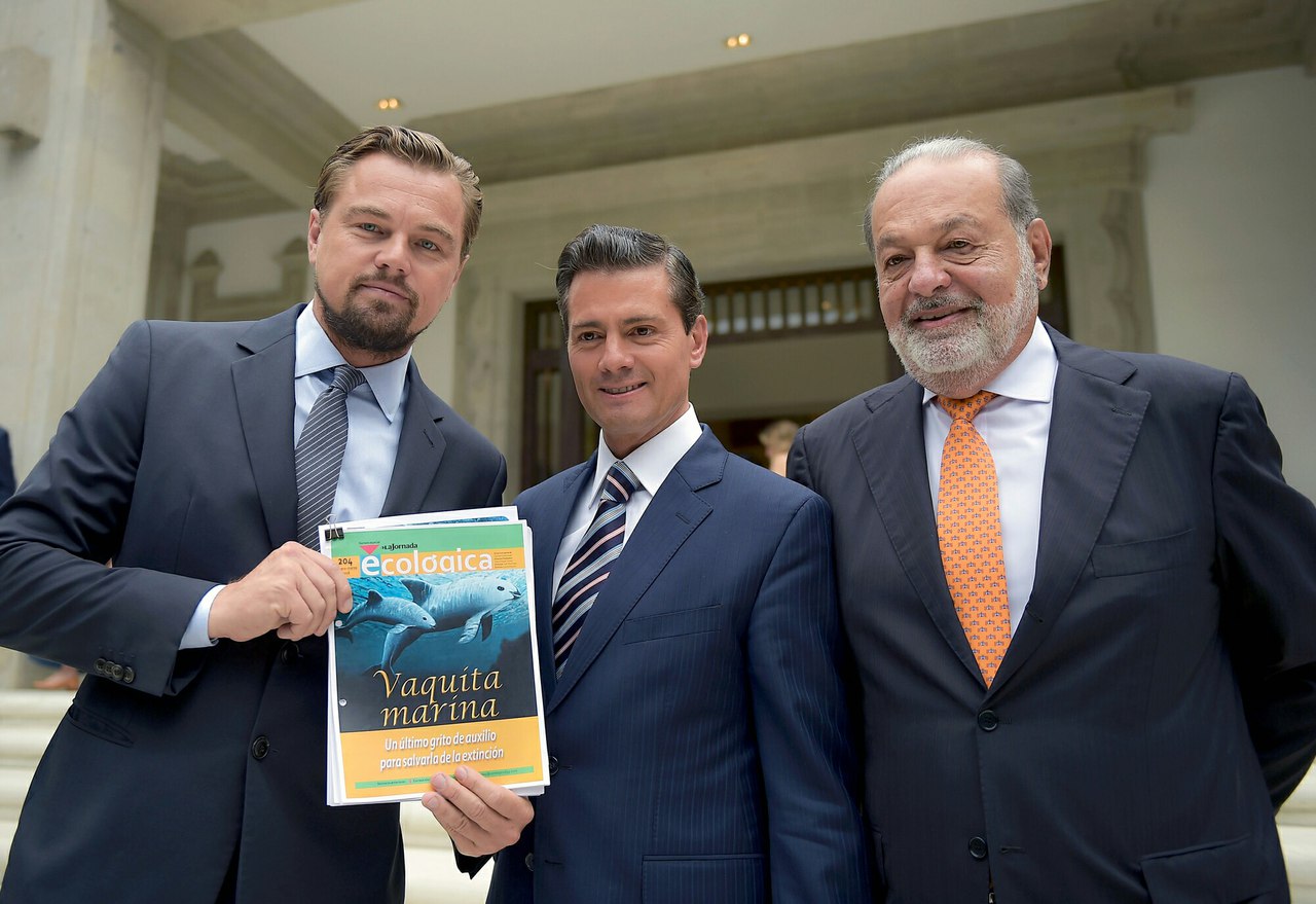 (ДиКаприо, президент Энрике Пенья Ньето, а также миллиардер Карлос Слим подписали соглашение о защите вымирающих вакит).