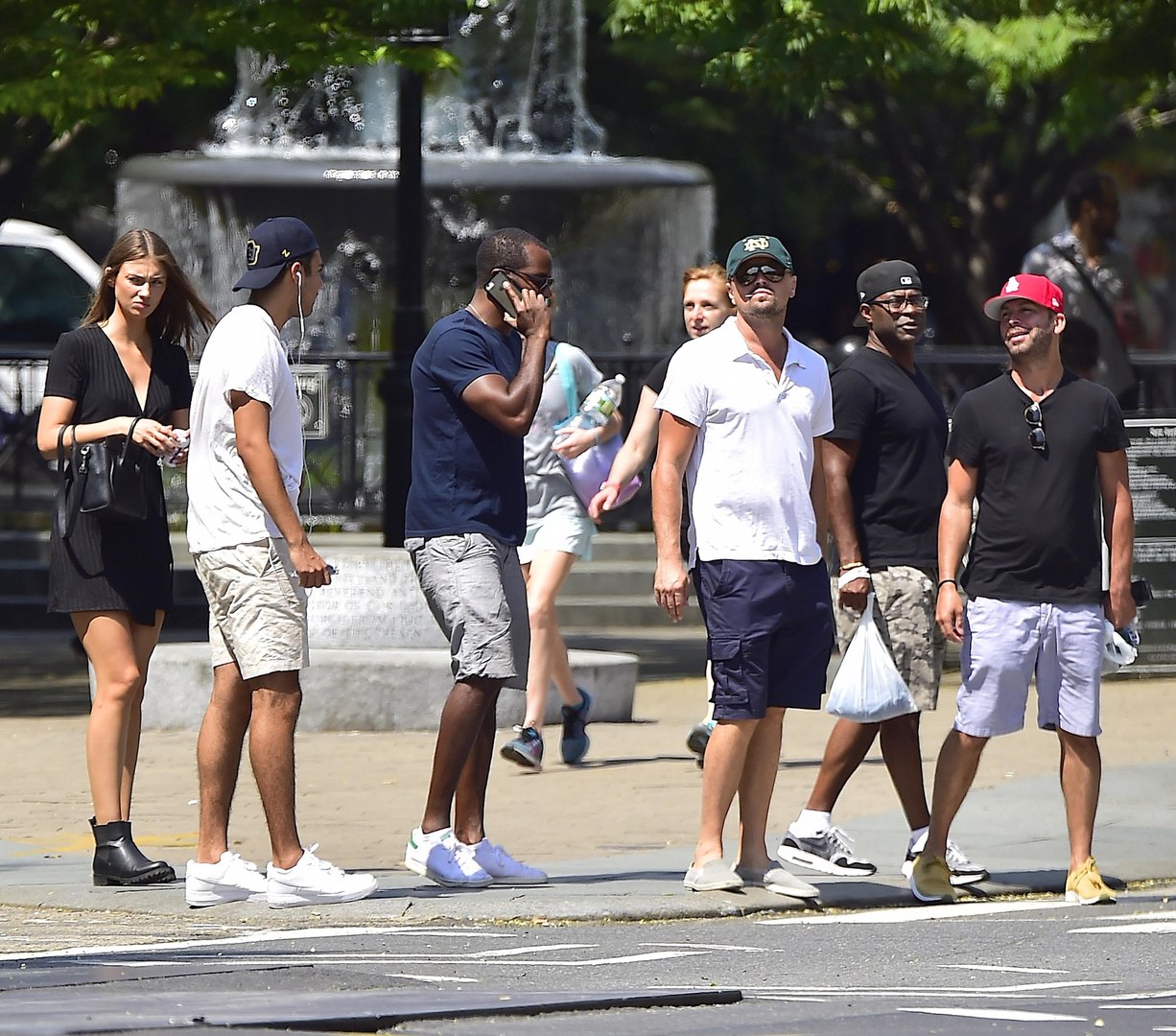 Лео в голубой футболке, синей бейсболке и белых шортах.