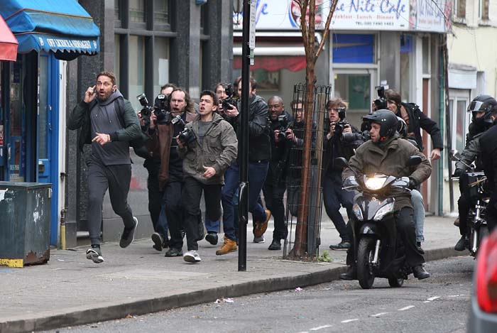 Реальная жизнь ... или жизнь катушки (ролика)? Джерард Батлер бежит из папарацци во время съемок рекламного ролика в четверг в Лондоне