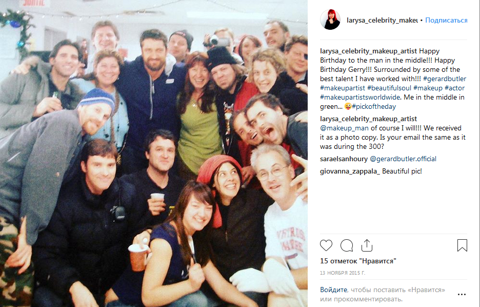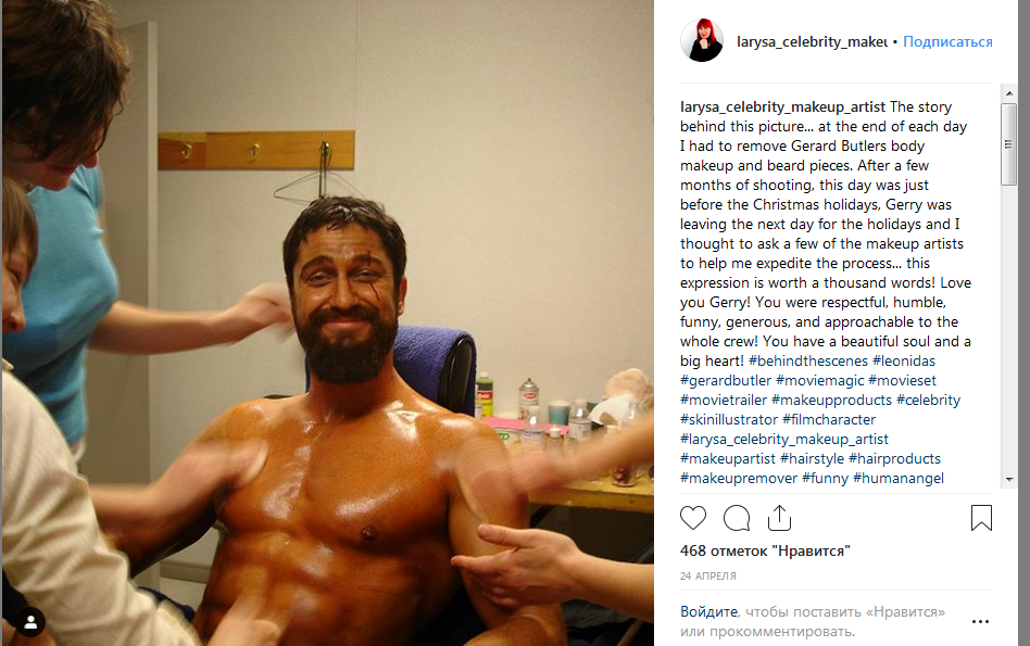 "История за этой картиной ... в конце каждого дня мне приходилось снимать макияж с тела Джерарда Батлера и кусочки бороды. После нескольких месяцев съемок, этот день был как раз перед рождественскими каникулами, Джерри уезжал на следующий день на каникулы, и я подумал попросить нескольких визажистов помочь мне ускорить процесс ... это выражение стоит тысяча слов! Люблю тебя Джерри! Вы были уважительными, скромными, веселыми, щедрыми и доступными для всей команды! У тебя красивая душа и большое сердце!"