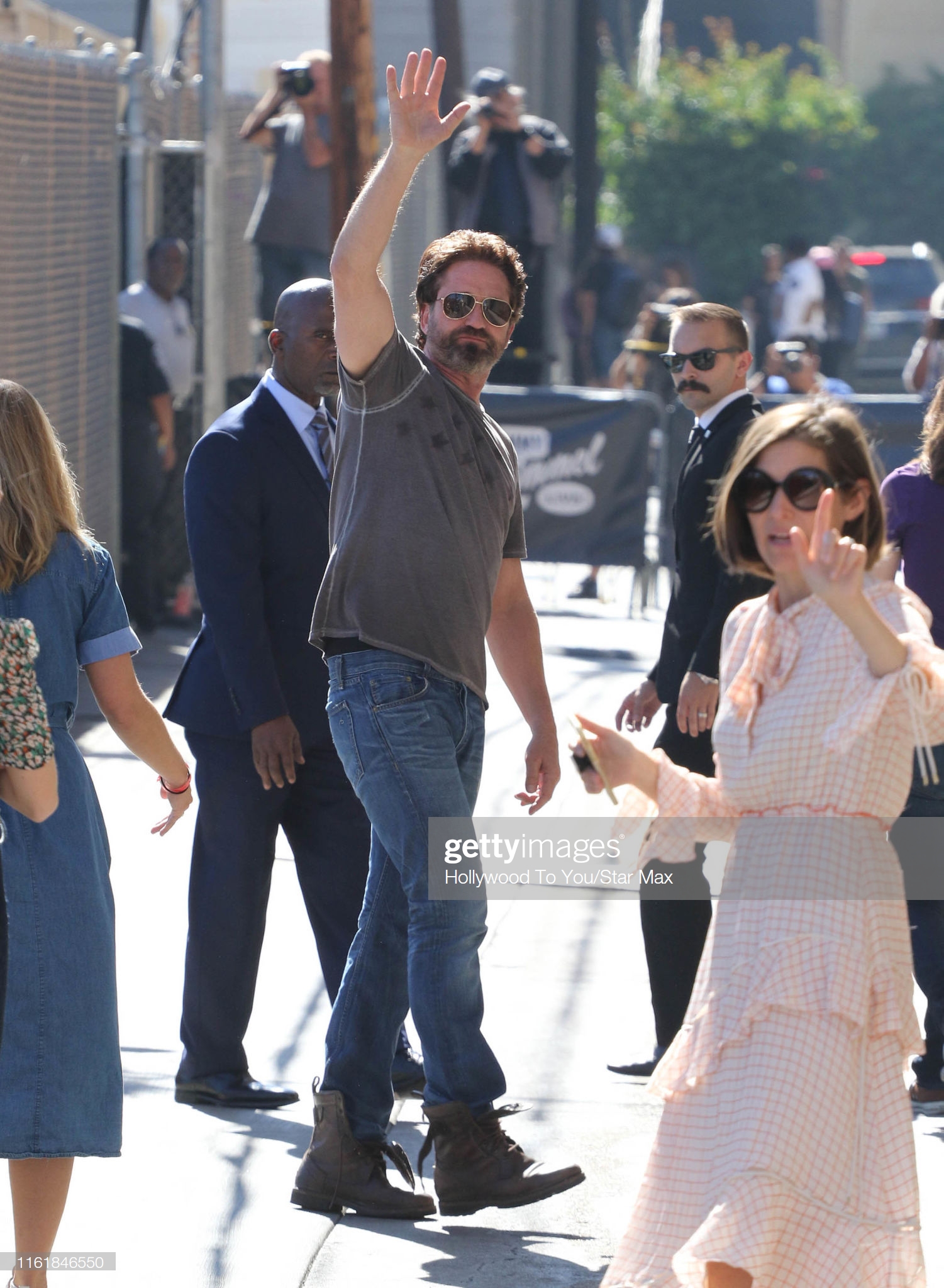 Голливуд, Калифорния-Джерард Батлер машет поклонникам, когда он прибывает в развлекательный центр El Capitan в Голливуде для выступления на Jimmy Kimmel Live 15 августа!