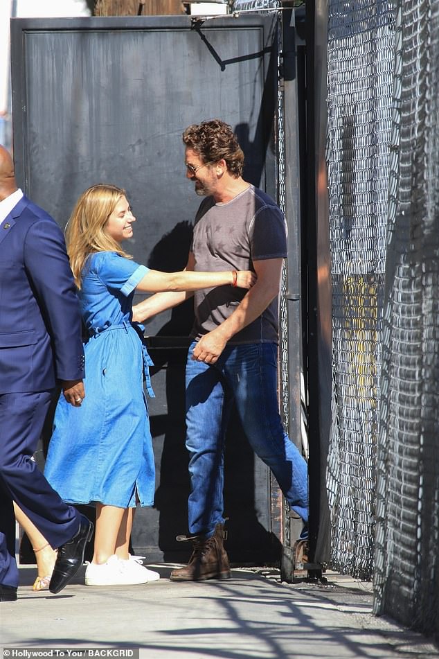Джерард Батлер делит сладкие объятия с женщиной, когда он прибывает на шоу Джимми Киммел