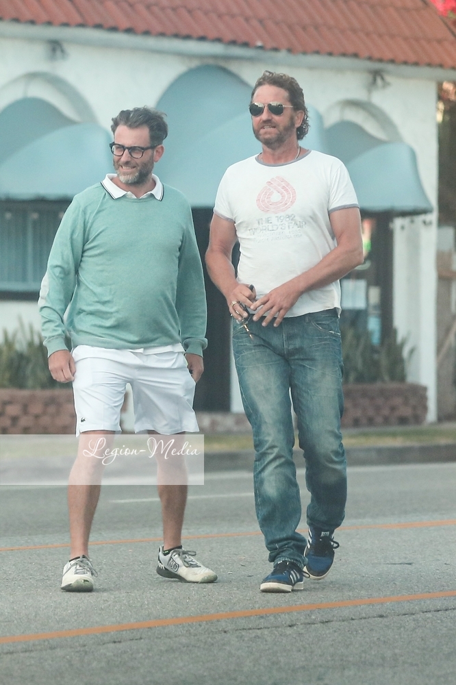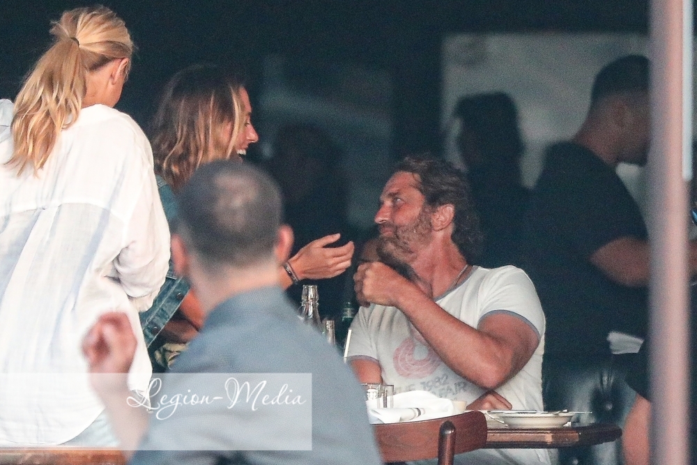 Джерард Батлер источает мужество, когда он и приятель встречаются с несколькими другими друзьями на обед и напитки в ресторане в Венеции