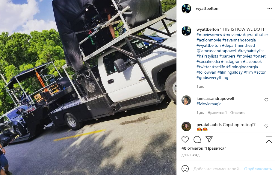 Только что закончились двухнедельные съемки «Погони» с Джерардом Батлером, Джейми Александром и Майклом Ирби.