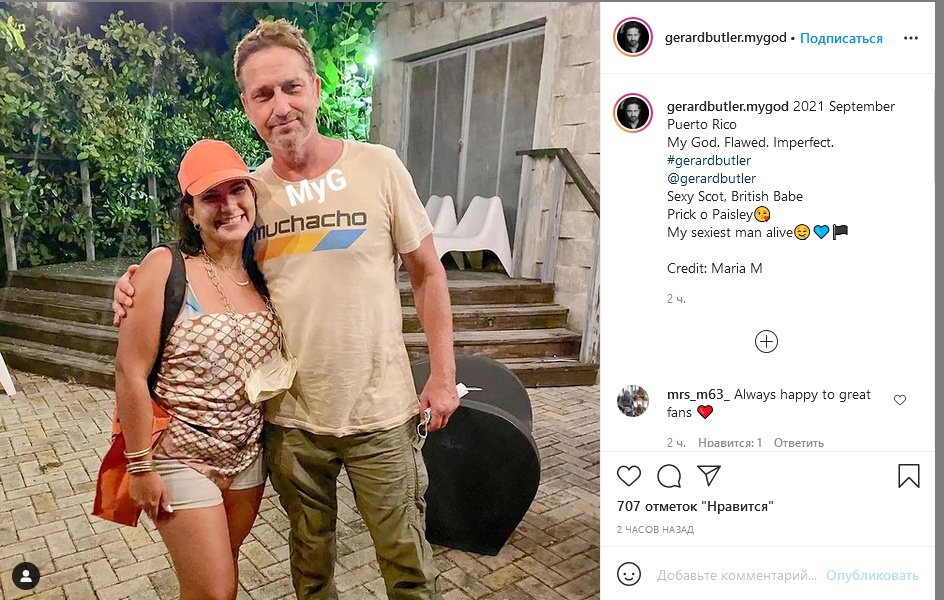 Джерарда Батлера. Он очень красивый и милый. Он в городе, снимает новый фильм.