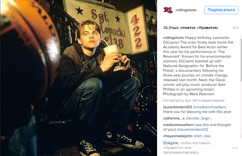 Лео поздравил журнал ROLLING STONE на своей странице в Инстаграме https://www.instagram.com/rollingstone/ "С днем рождения, Леонардо Ди Каприо!