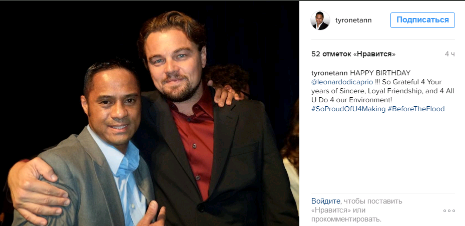Quinto Universo (Бразилия) https://www.instagram.com/quintouniverso/ Лео поздравил актер Tyrone Tann https://www.instagram.com/tyronetann/ "tyronetann С Днем Рождения !!! @leonardodicaprio я так благодарен за годы искренней верной дружбы с вами, и нашей окружающей средой! # SoProudOfU4Making #BeforeTheFlood