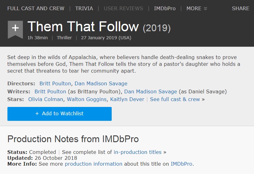 В фильме «Them That Follow», проходящем в рамках драматического конкурса «Сандэнс» в США, есть независимый актерский состав, в котором также участвуют Оливия Колман и Уолтон Гоггинс, и в эпоху, когда «Сказка о служанке» стала культурным критерием духа времени, тревожным изображением этого фильма. сурового патриархального общества может резонировать.