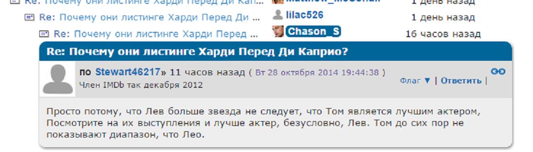 LaLatynia писал(а):Народ на странице Лео в ИМДБ, продолжает возмущаться, почему Харди так и возглавляет список актеров Возвращенца). http://www.imdb.com/title/tt1663202/boa ... 612214?p=2 Наверняка, если бы я была горячей поклонницей Ди Каприо, я бы тоже возмущалась).
