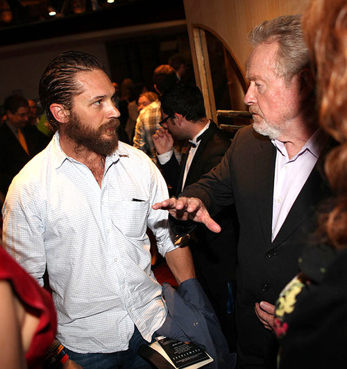 Ридли Скотт и Том Харди на премьере Прометея обсуждают прическу главного героя в их будущем фильме Ребенок44. (Ридли Скотт продюсирует Ребенка)