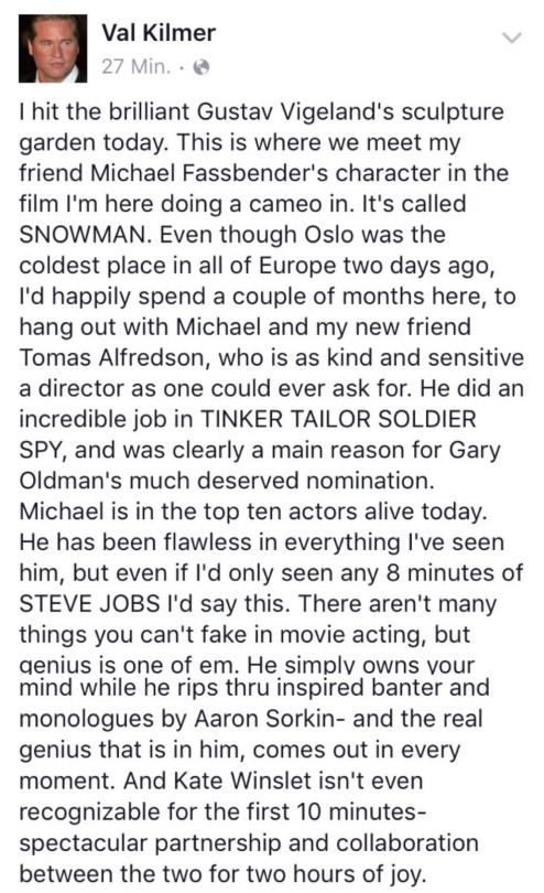пишет, что Фасс был охренительным во всем, в чем Вэл видел его, но даже если бы Вэл видел только любые 8 минут игры Фасса в Джобсе, - он написал бы тоже самое.