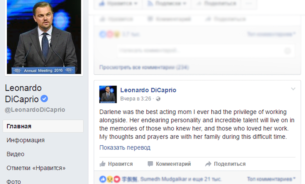 Вчера 29 марта, Леонардо в своем Фейсбуке опубликовал пост-соболезнование по поводу кончины Дарлин Кэйтс