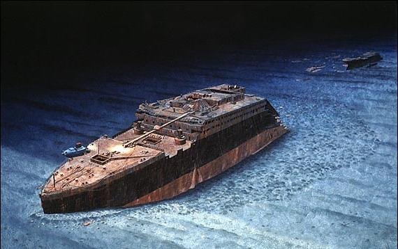 Обломки «Титаника» покоятся на глубине 3750 м. Впервые их обнаружила экспедиция Роберта Балларда в 1985 году. Последующие экспедиции подняли со дна тысячи артефактов. Носовая и кормовая части глубоко ушли в донный ил и находятся в плачевном состоянии, подъём их на поверхность в целости не представляется возможным.