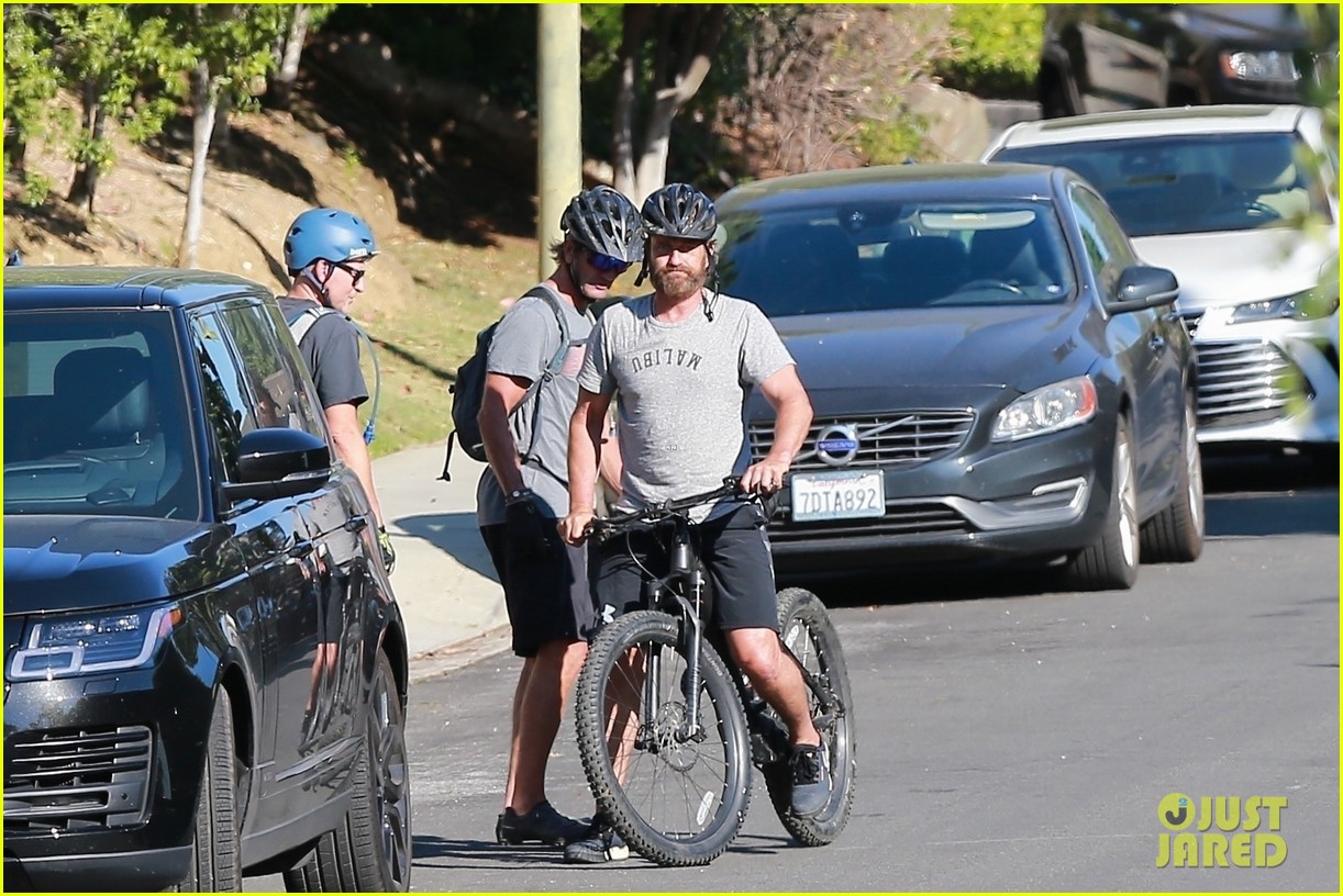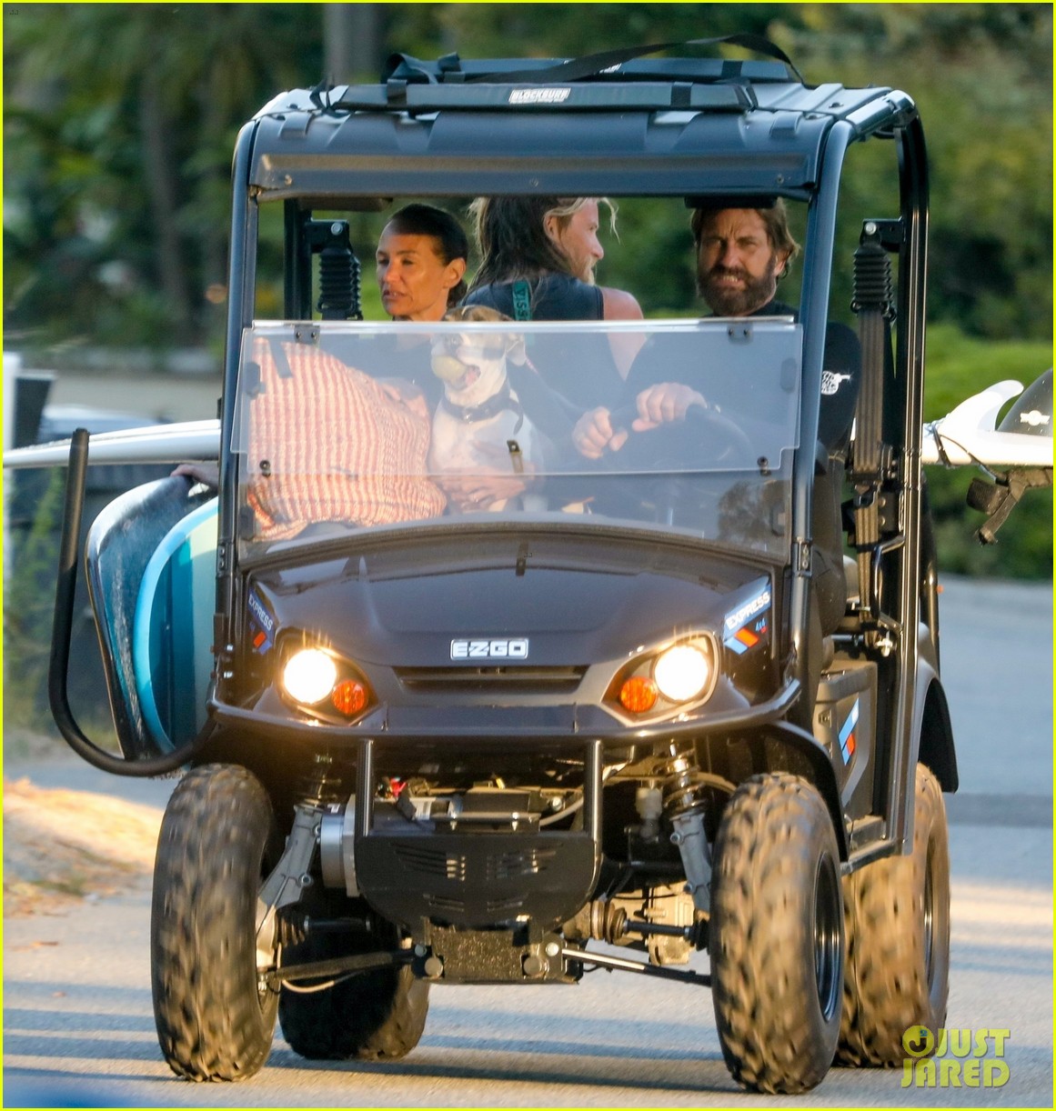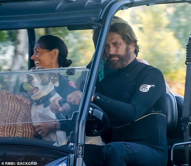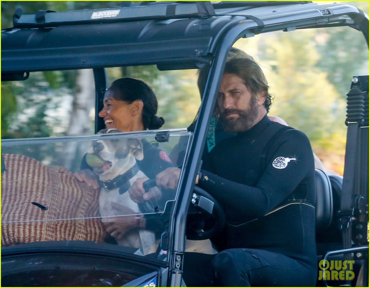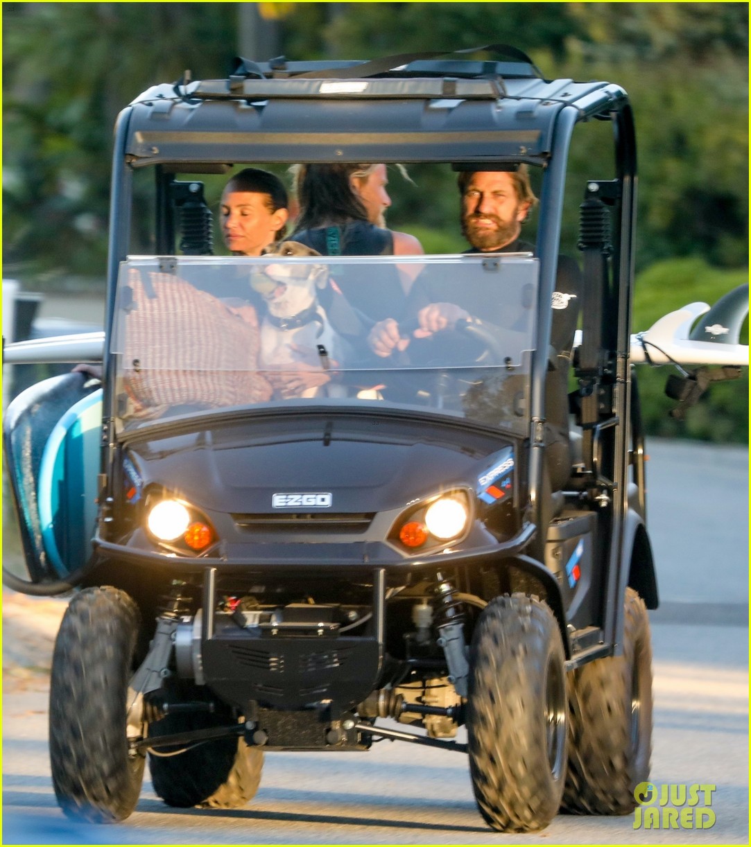 Джерард Батлер в гидрокостюме едет 4x4 ATV домой после серфинг сессии в Малибу с Morgan Brown