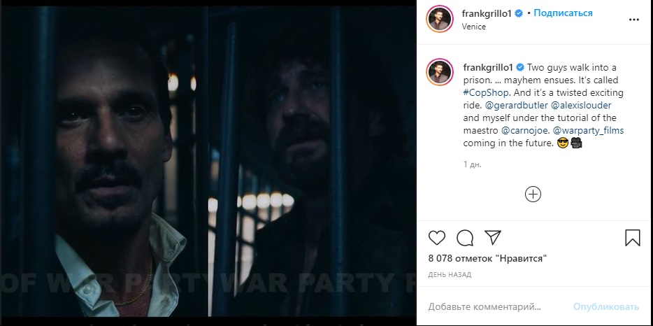 https://www.instagram.com/p/CIfD9p4J8K1 ... 8p5CRE8PiQ Двое парней входят в тюрьму. .. начинается хаос. Это называется #CopShop. И это очень захватывающая поездка. @gerardbutler @alexislouder и я под руководством маэстро @carnojoe. @warparty_films грядет в будущем