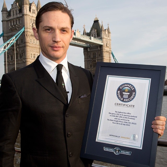 British actor Tom, who starred in The Dark Knight Rises as the villainous Bane, was presented with an official Guinness World Records certificate, certifying that the super hero movie holds the current title for Highest box office film gross (2D) - opening weekend.