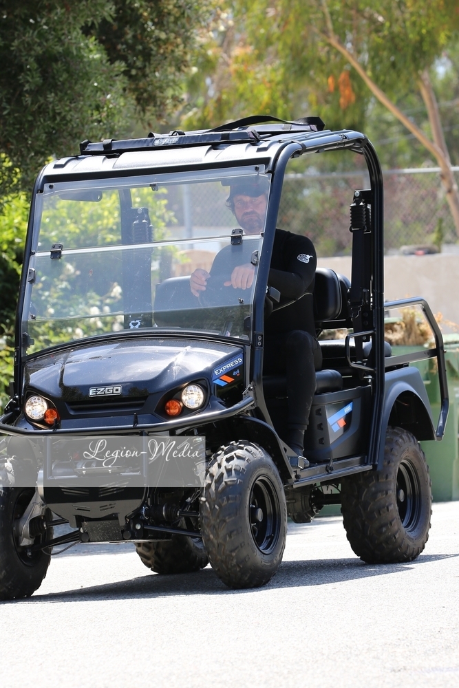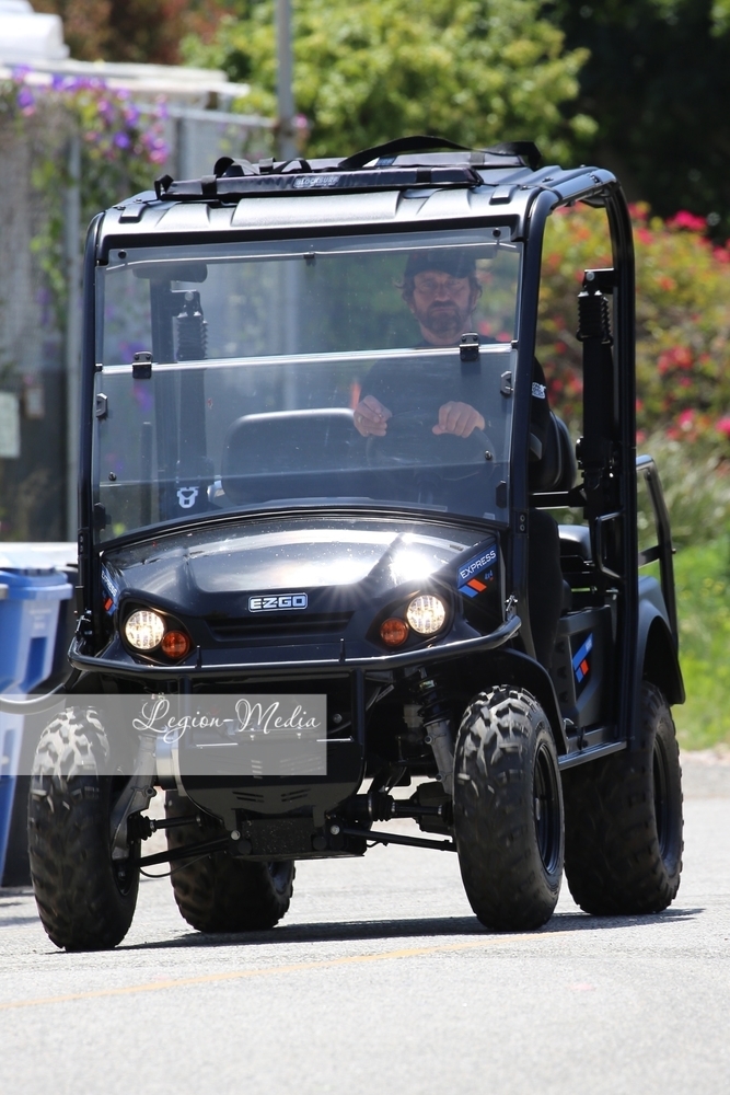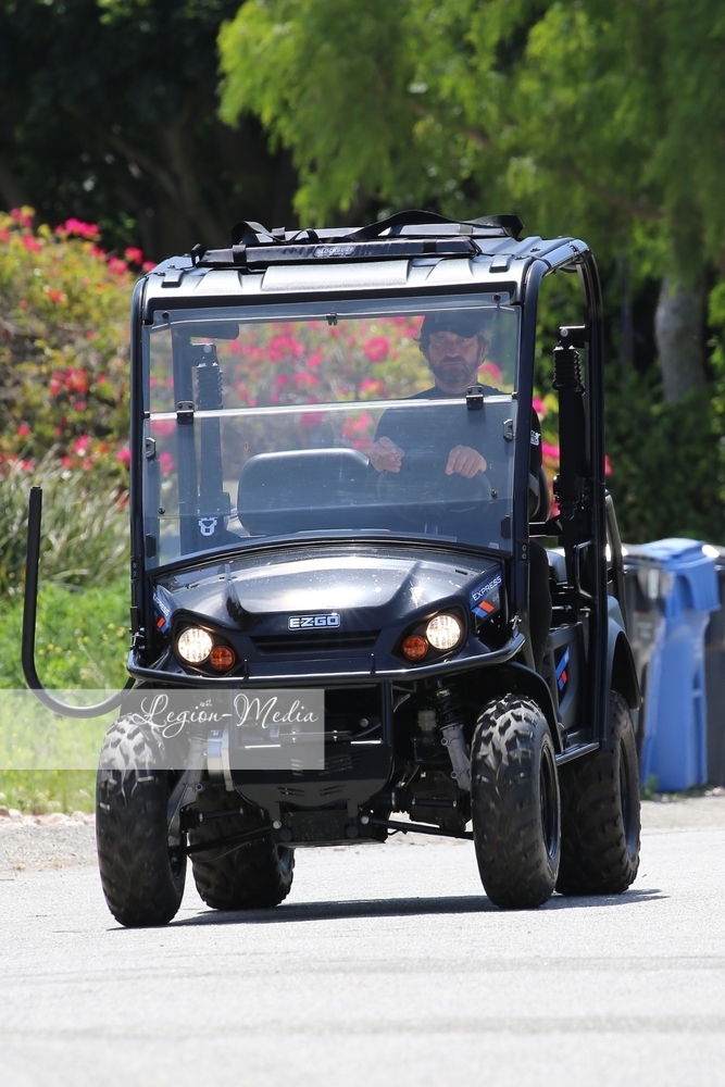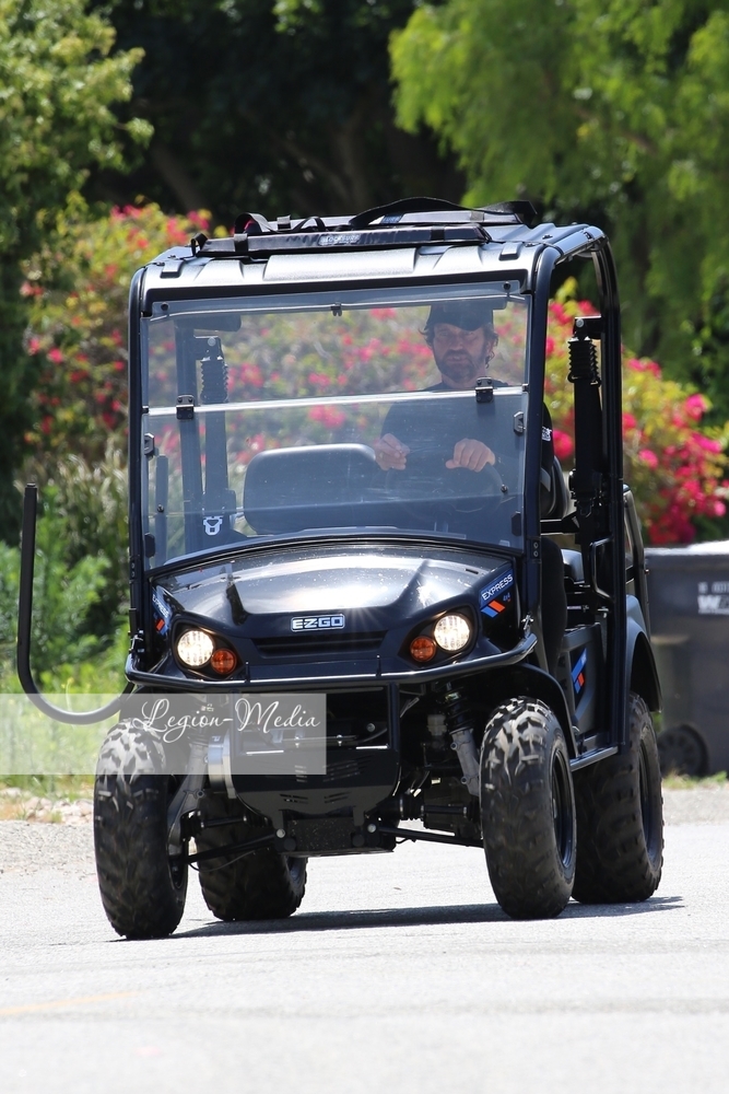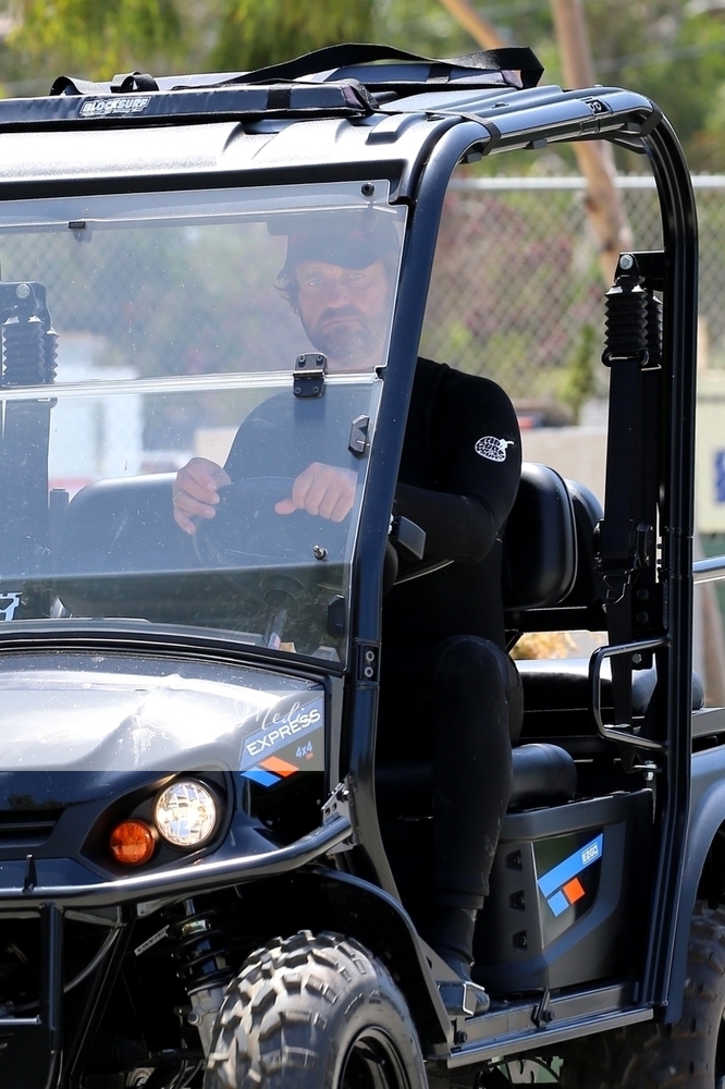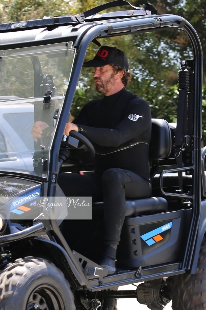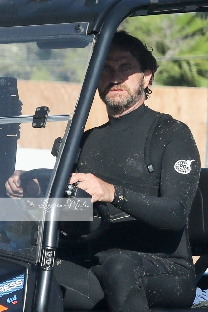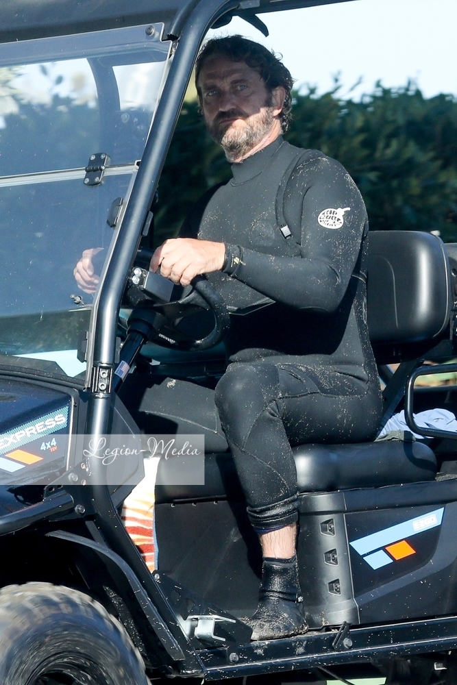 Gerard Butler Drives His Express Golf Cart Back To His House Wearing His Wetsuit After Getting In A Surf Session In Malibu.