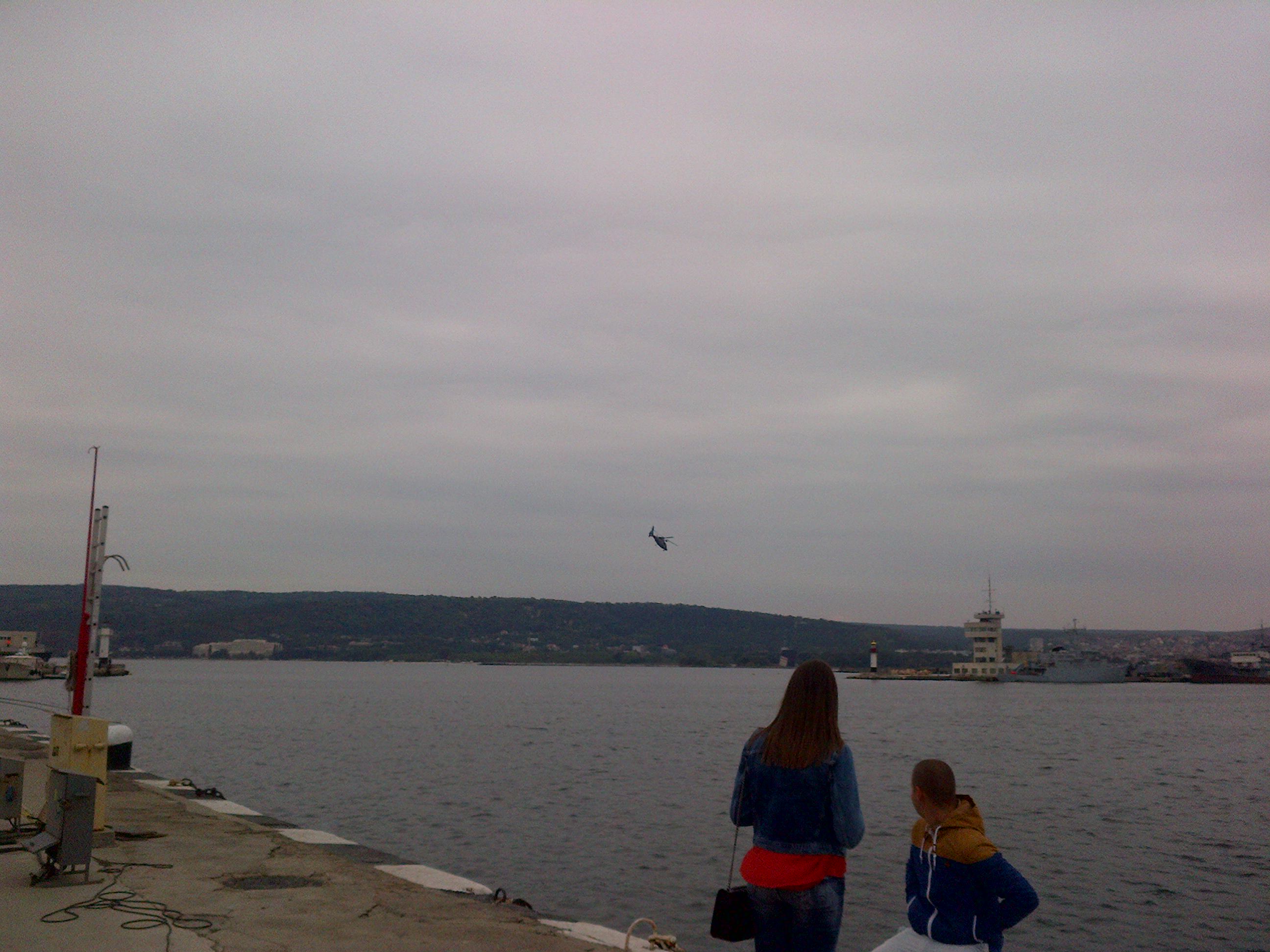 После возвращения в порт удалось сфоткать вертолёта, который резко вылетел (я бы даже сказала выпрыгнул) из съёмочной площадки и так же резко там и вернулся, пока переключилась на видео, заснять удалось только звук. Долго ждала тейк 2, но не дождалась. То что сегодня издали видно было- моряки в тёмных униформах. Конец репортажа.