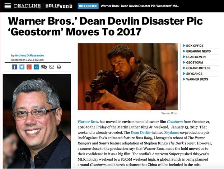 Dean Devlin @Dean_Devlin So excited! Gerard Butler ‘Geostorm’ Disaster Pic Moves To MLK Weekend 2017 | Deadline http://deadline.com/2015/09/geostorm-wa ... 201511788/ …